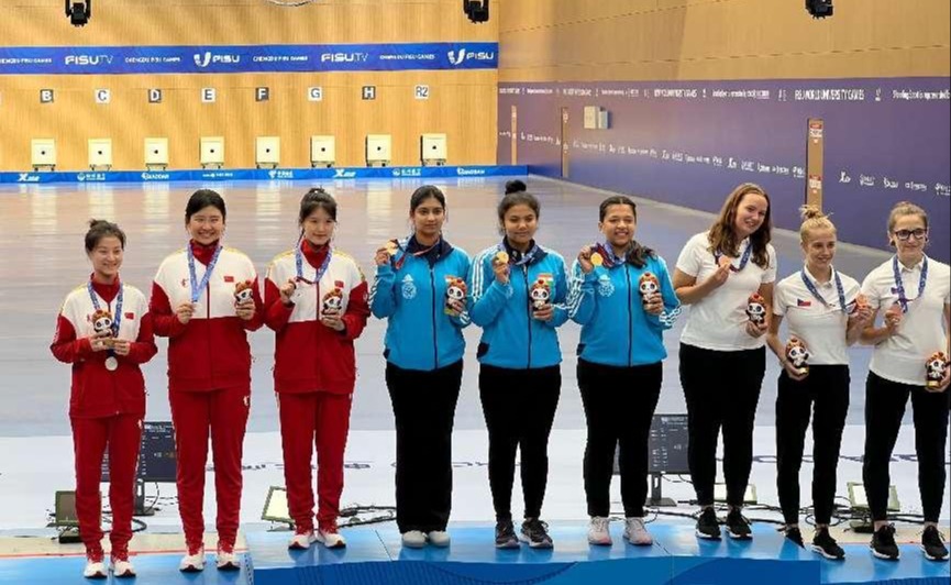 2023.07清华射击队队员王岳丰与队友在成都大运会夺得金牌