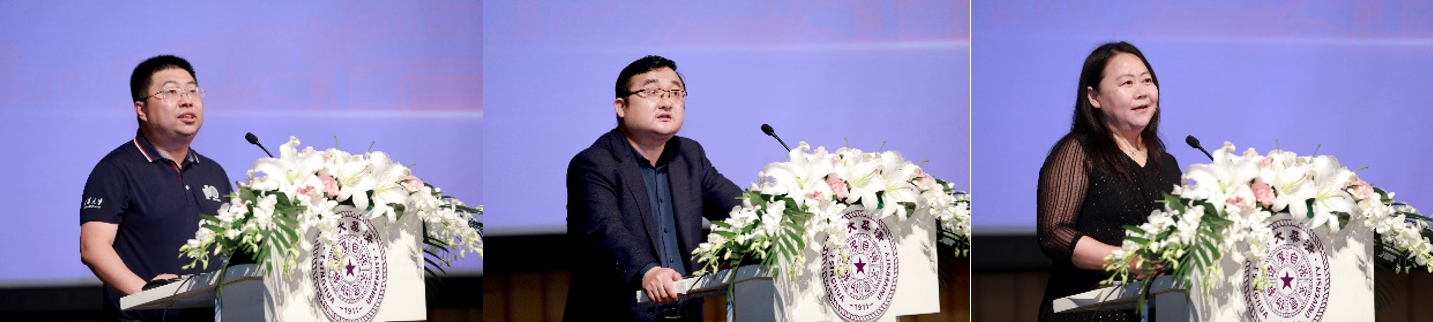 在校生代表张驰(左)、新生代表孙勇(中)、王彬彬(右)发言