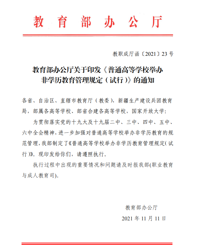 第三十二条 职业高等学校、独立设置的成人高等学校、开放大学举办非学历教育参照本规定执行。